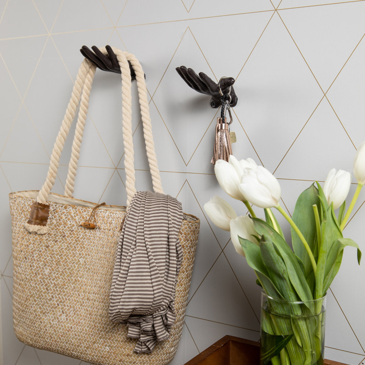Shaped like an open hand so you can hang bags, coats, scarves hats or keys.