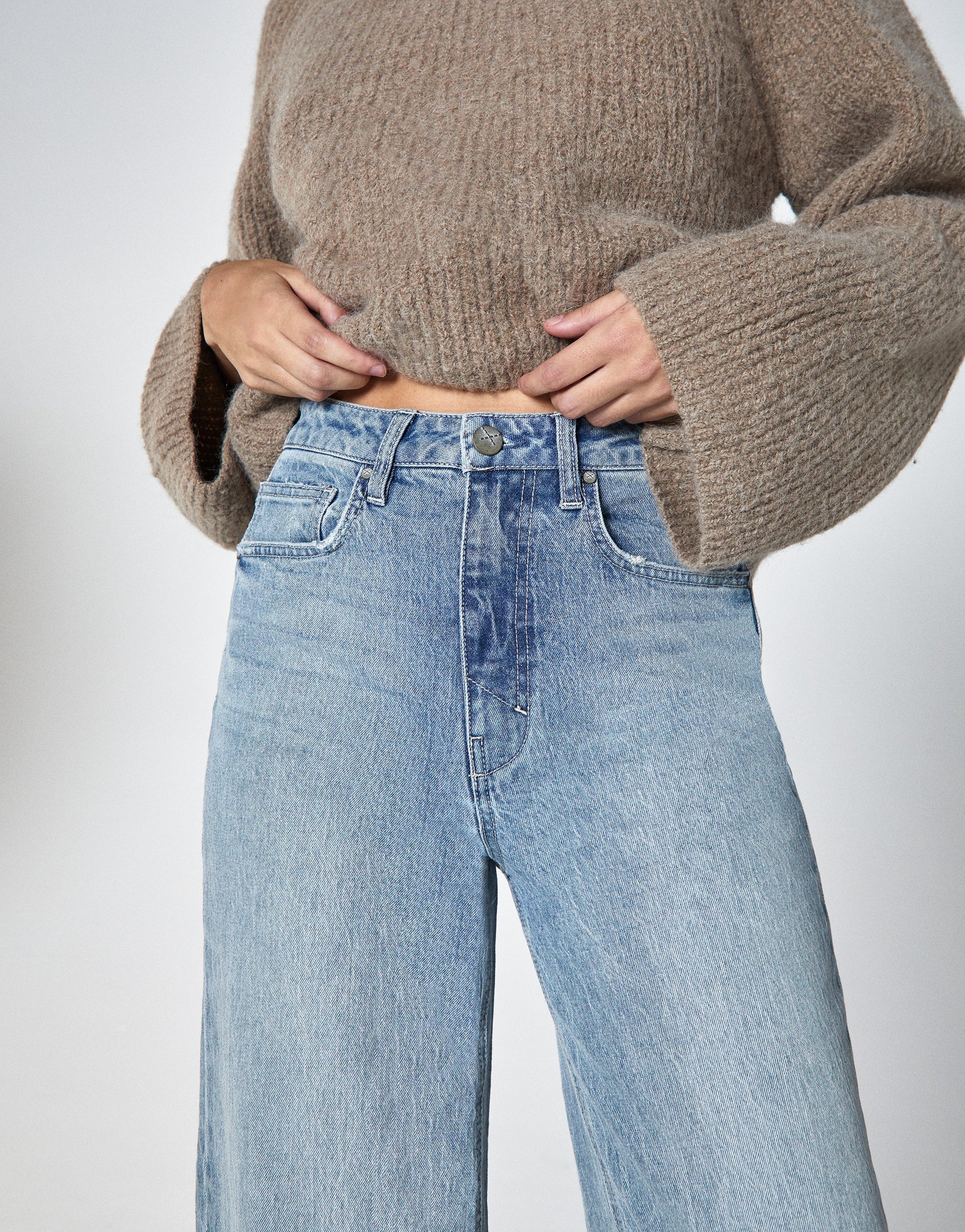 Noemi is Unpublished's high-rise wide leg crop. Made in 100% cotton medium-weight rigid denim. Featuring a raw hem detail and antique nickel hardware.