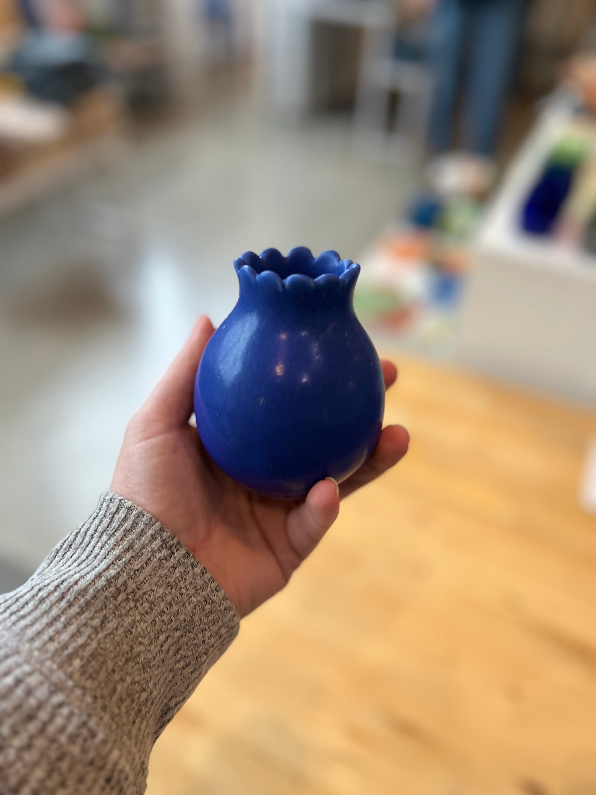 A compact, round bud vase with as cute scalloped top. Perfect for a few flower stems.